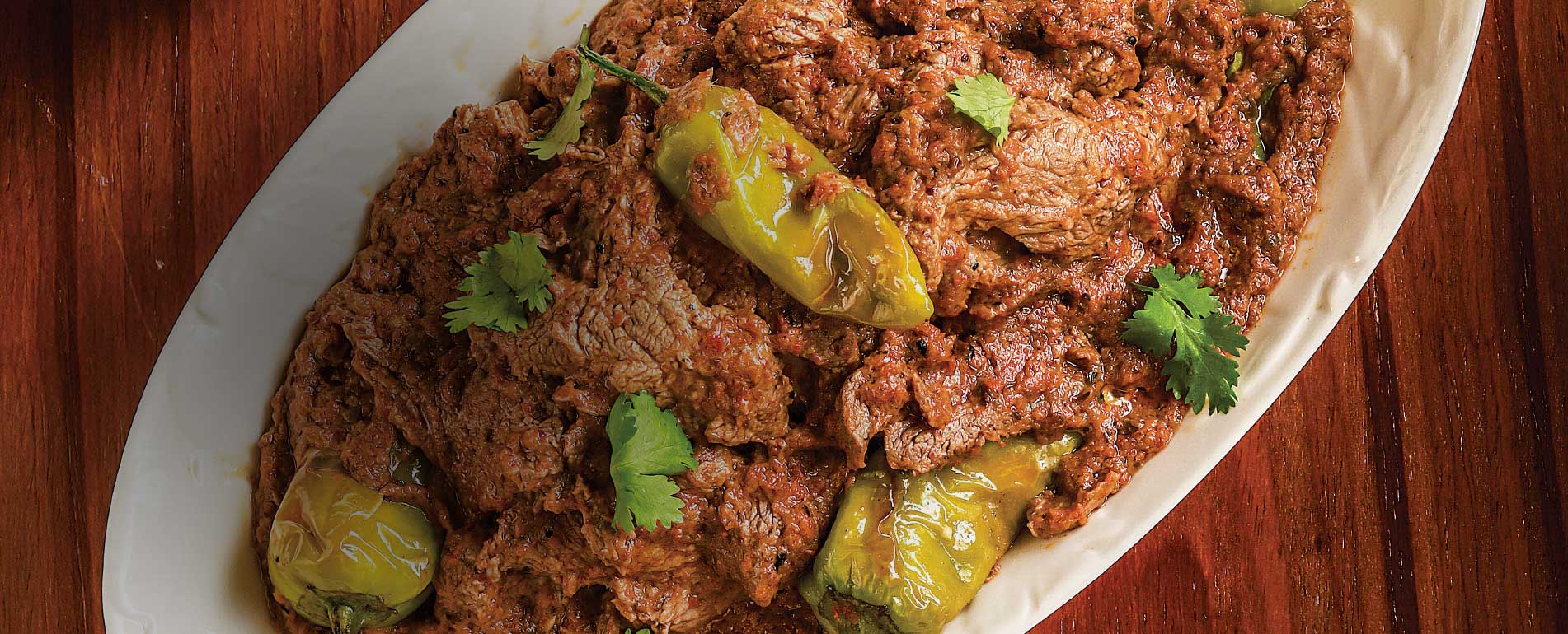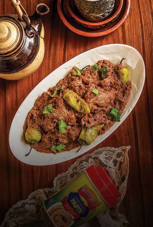 Start with slicing the green chillies in the middle and fill them with Shangrila Pickle Paste. Pour some oil in the pan and fry ginger and garlic paste in it. Then add meat in the pan and fry it. Next mix yogurt evenly in a separate bowl and then add it in the meat pan. Stir it until all the components in the pan are mixed up evenly. Now add all the spices and sauces in the pan and mix evenly. Keep stirring and add water as needed until the meat is tender. Once the meat is cooked, spread achar filled green chillies over the meat and cover the pan tightly and let it sit on low heat for a bit. Once ready, garnish with coriander and serve.