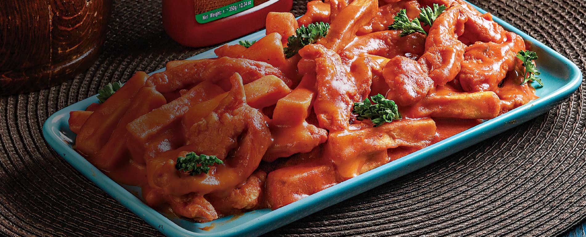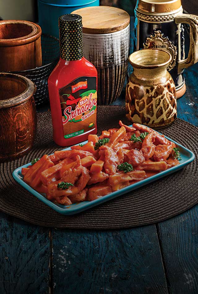 Heat oil in a pan add potato fries and fry for 10 to 12 minutes. Remove and set aside. In a bowl add chicken, Shangrila Hot Sriracha Sauce, garlic powder, chicken powder, salt, white pepper and mix well. Refrigerate for an hour. Place the potato fries on a baking tray, place the chicken pieces on top. Bake in a preheated oven on 250°C for 20 minutes. Remove, place cheese slices at top and bake again for 10 minutes. Remove and serve hot.